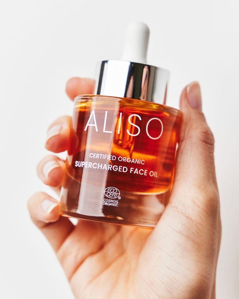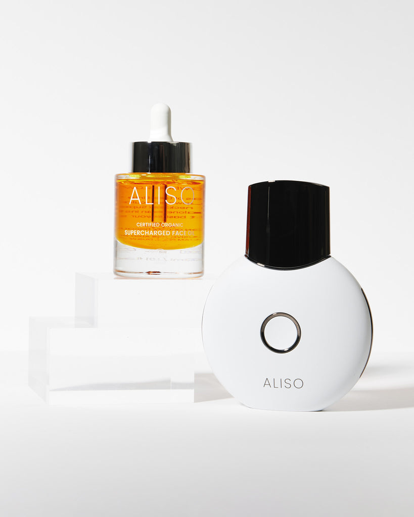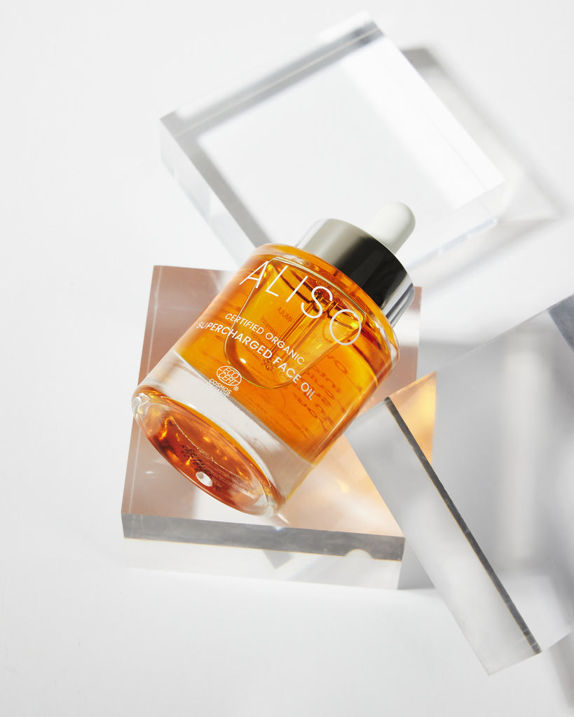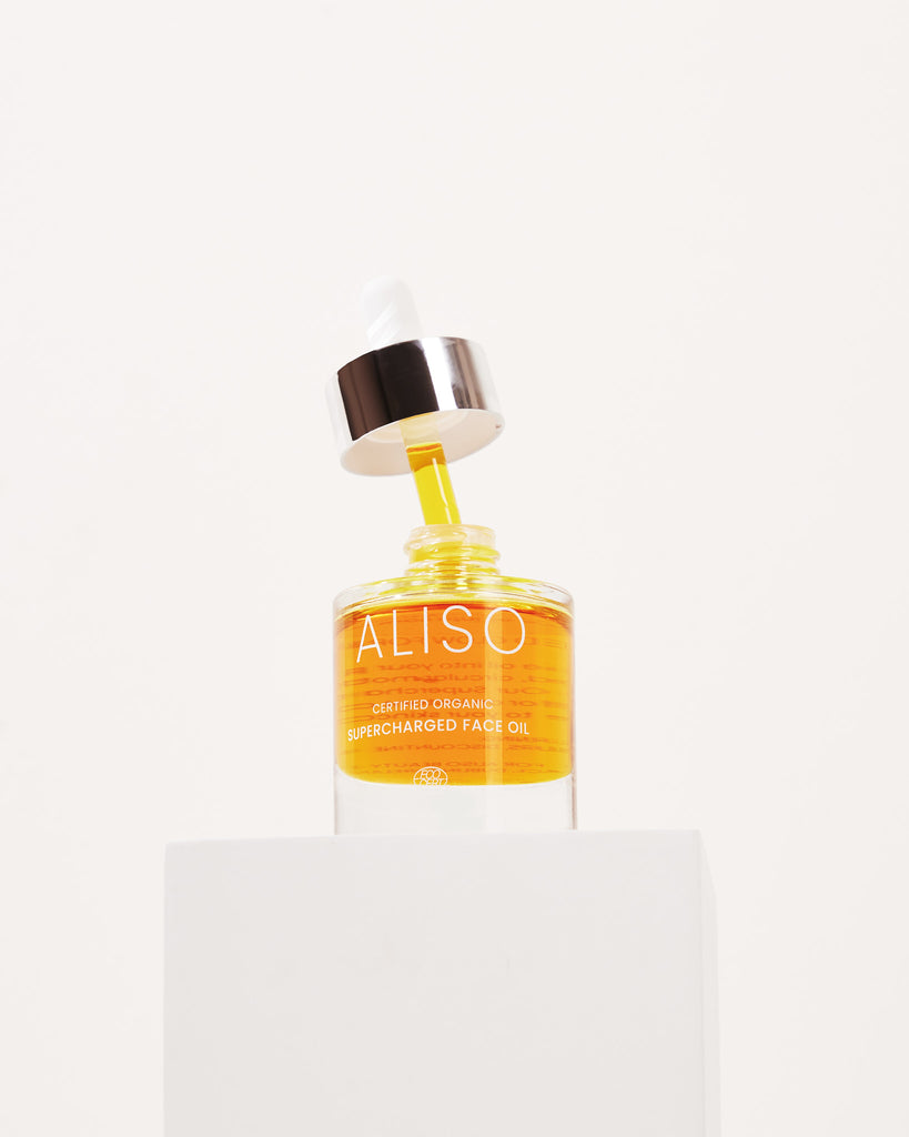 To activate the dewy goodness of ALISO's Supercharged Face Oil, massage 2-3 hydration-packed drops into your skin after cleansing.