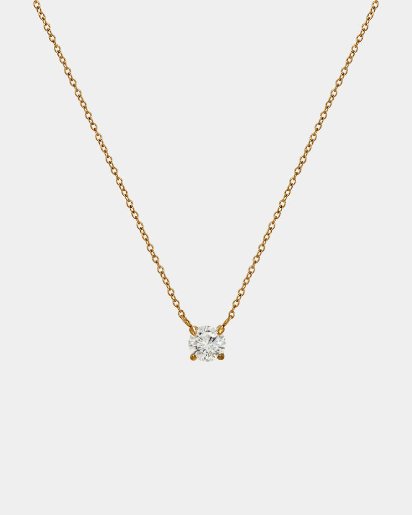 18k gold plated necklace featuring a single white synthetic zirconia.Copper
